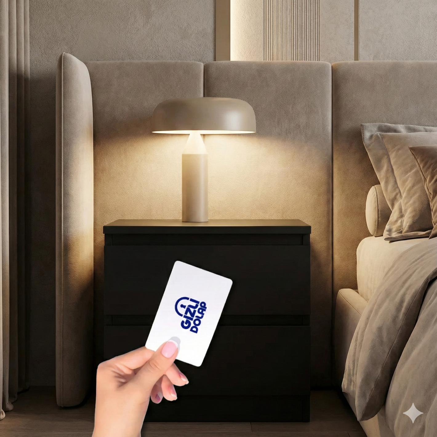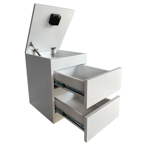 Gizli Bölmeli Komodin'in güvenlik kilidi, standart dört AA pil ile çalışır. Elektrik bağlantısına ihtiyaç duymadan, güvenliğiniz ve eşyalarınız için pratik bir çözüm sunuyor. Böylece istediğiniz yere kolayca yerleştirebilirsiniz.